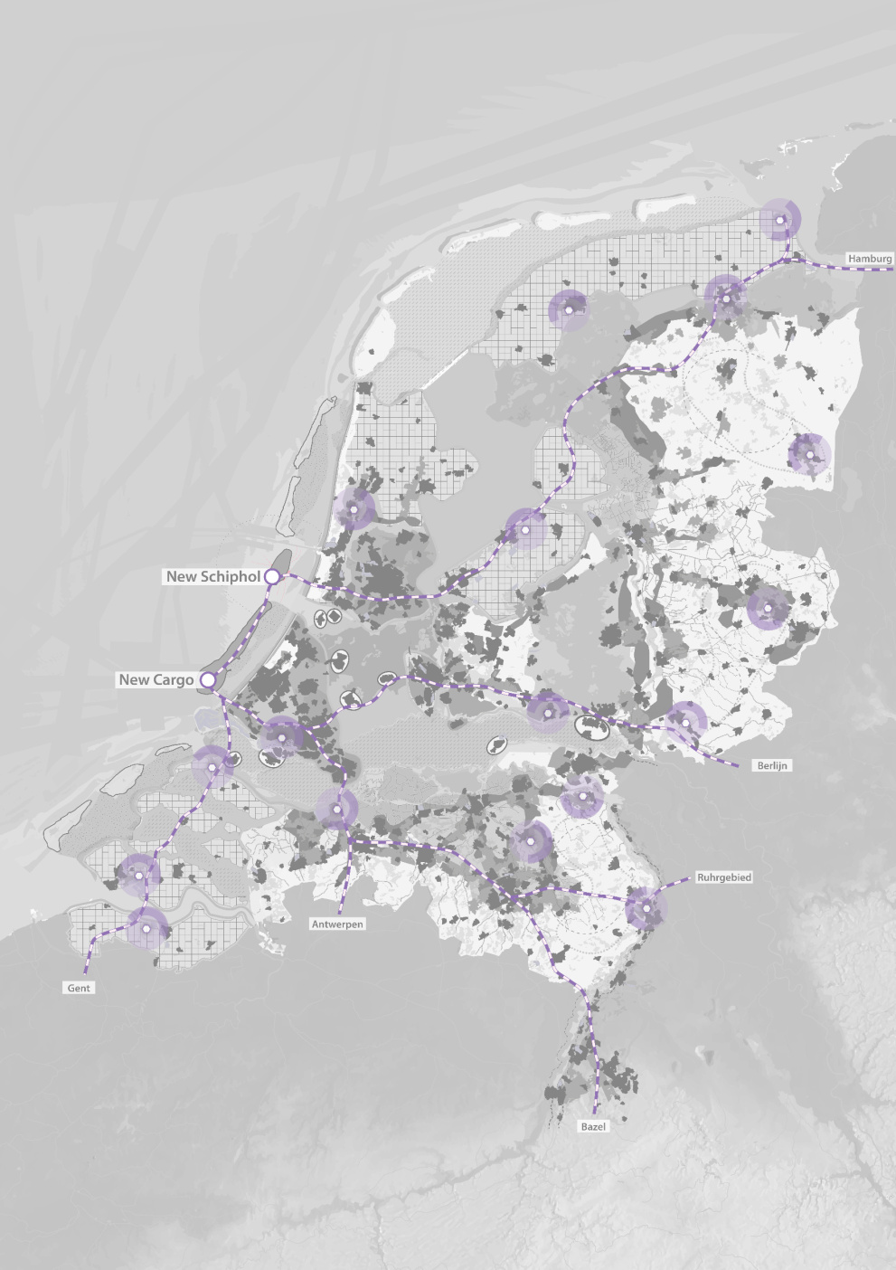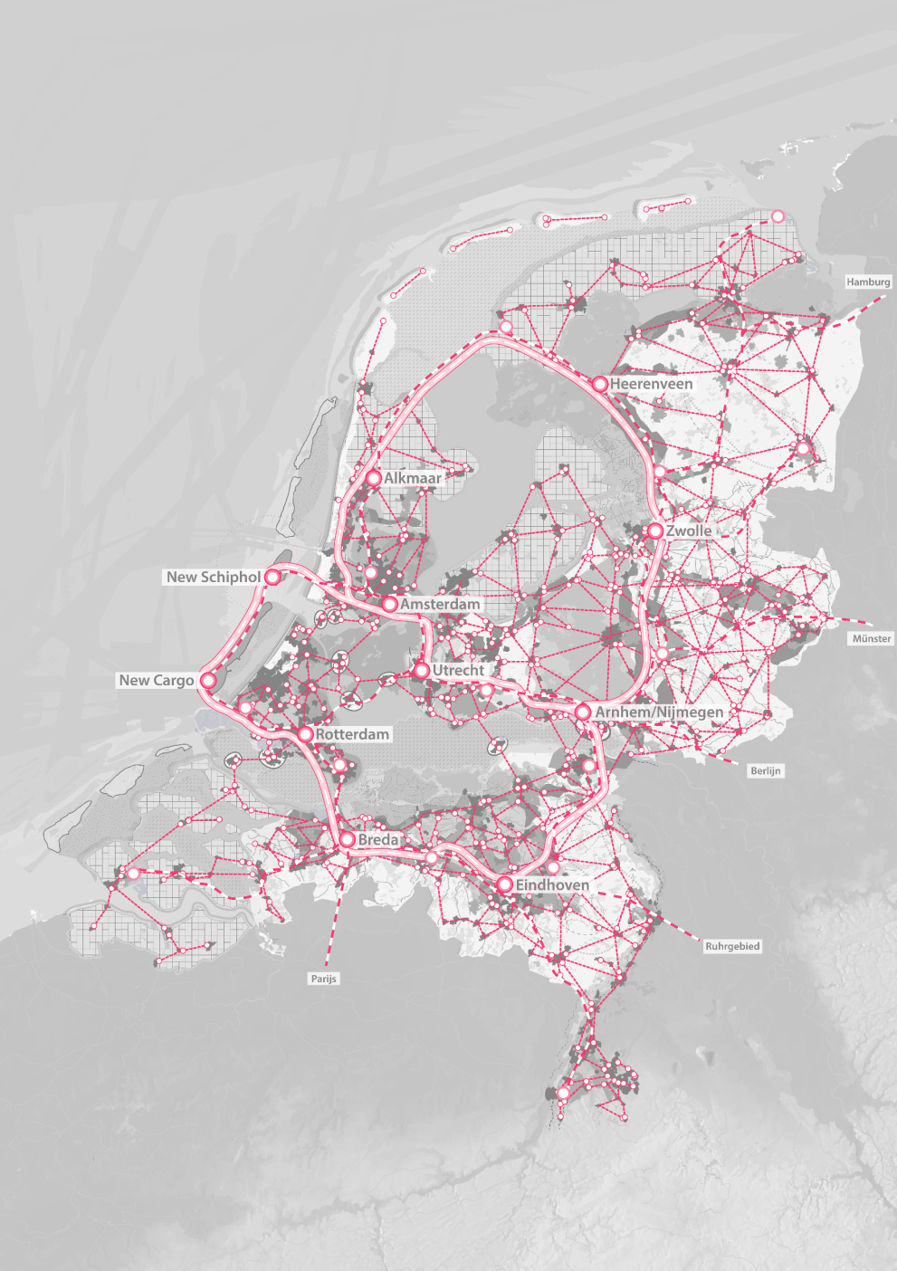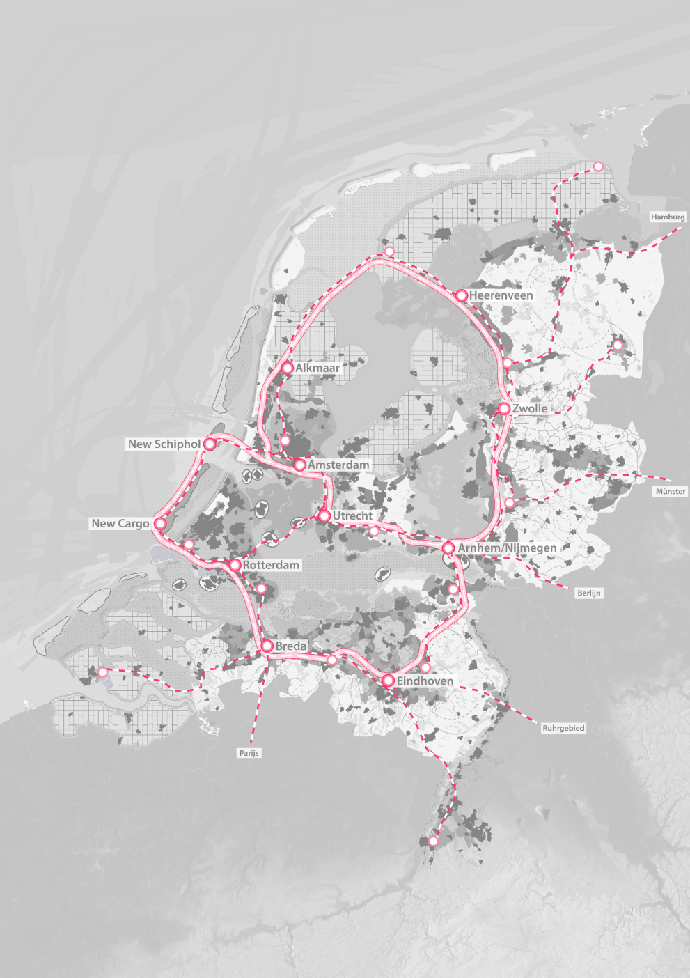 Nederland krijgt drie circuits met snel hoogwaardig openbaar vervoer waar ook de nieuwe nationale luchthaven (als ruimtelijke entiteit) in de Noordzee op is aangesloten. In Eindhoven en Arnhem kun je direct inchecken voor je vlucht vanaf het nieuwe Schiphol. De loops zijn in Amsterdam, Rotterdam en Utrecht verknoopt zodat onderliggende vervoersystemen goed aansluiten.